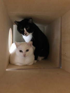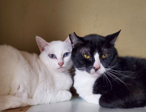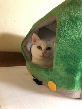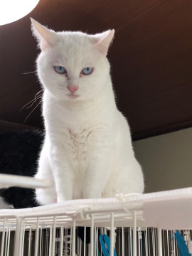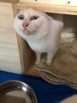 ○真っ白で小顔、青くてキレイな目、真っ白で長い尻尾を持つ美猫です。