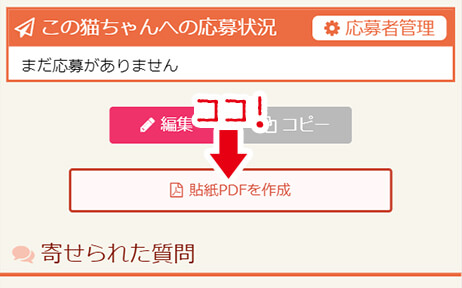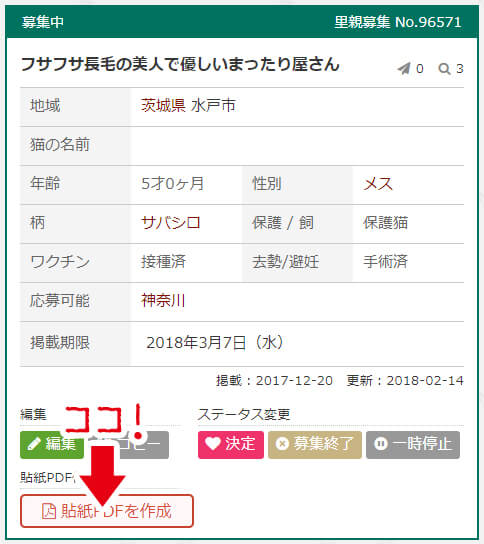 ご自分の里親募集の詳細ページにある「貼紙PDFを作成」のボタンを選択すると、作成ページが表示されます。