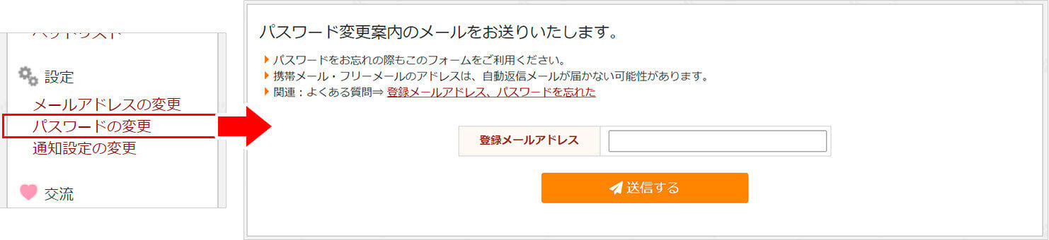 パスワード変更ページへ移動していただき、登録メールアドレスをご入力、送信ボタンを押してください。