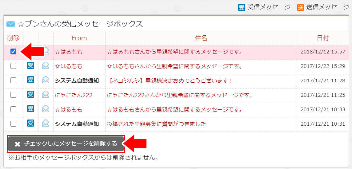 PCの場合、メッセージリストの削除したいメッセージの左横にあるチェックボックスにチェックを入れ、その下の「チェックしたメッセージを削除する」をクリックすると削除できます。