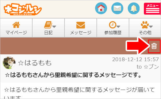 SPの場合、メッセージ詳細の右上にあるゴミ箱マークをタップしてください。