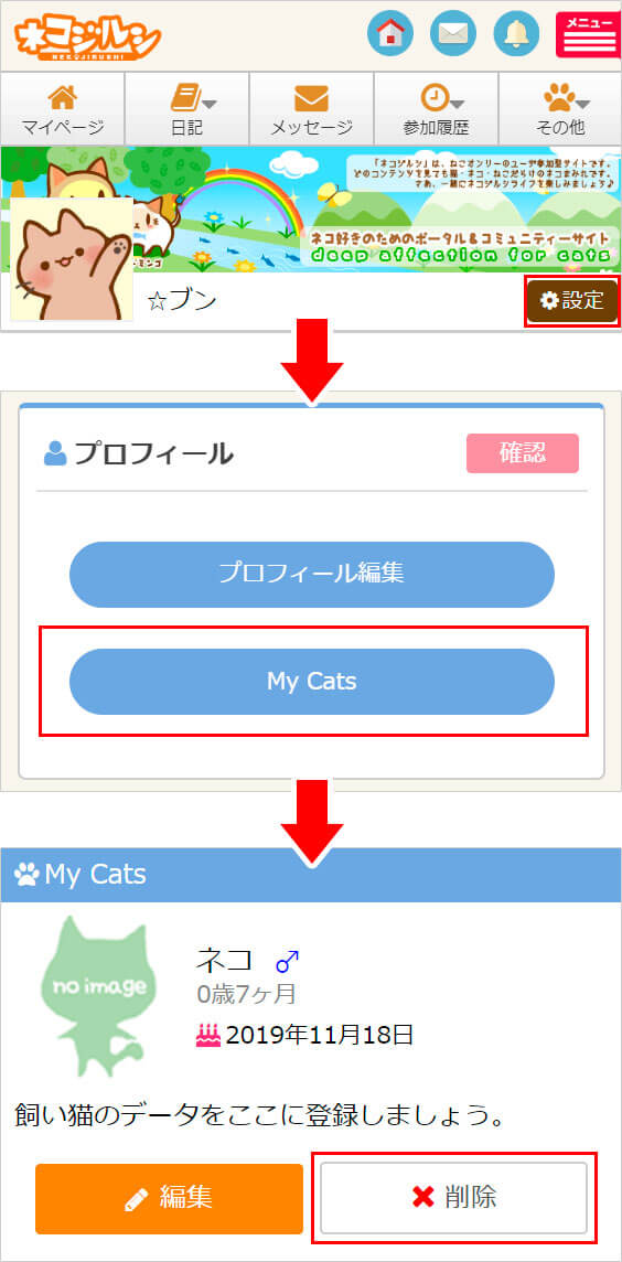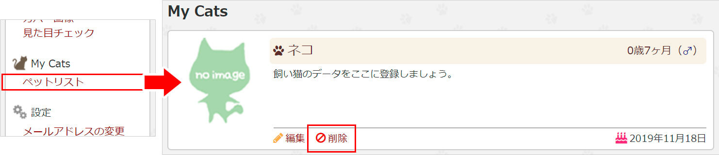 2. マイページよりMy Catsの一覧に移動していただくと「削除」というリンクがございます。