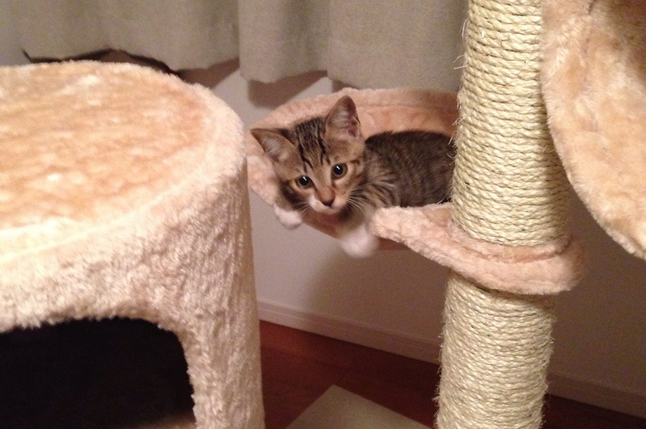 テーブルに置いておくと、上に載って咥えてキャットタワーのある