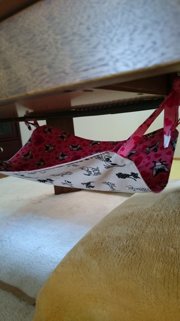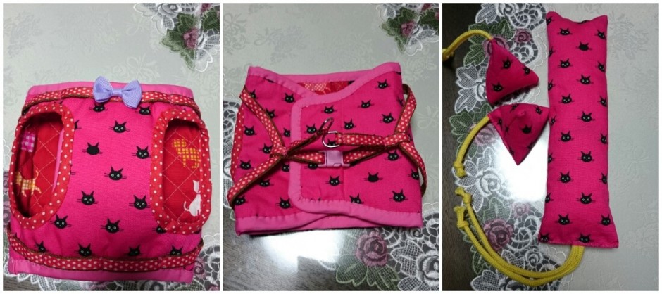 写真は私の作った4個目のハーネスです。プレゼント用に内側はミシンで表のバイヤステープ等は手縫いで作りました。