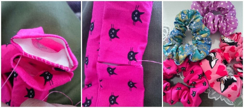 裏返して65センチの輪にします。一生懸命折り返して10センチの輪を縫い合わせます。