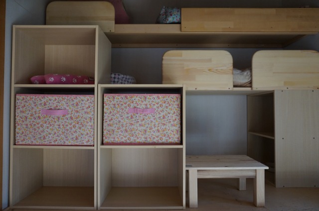 2段の収納ボックスを両端に置いて、その上に板を置き釘打ちしてあります。収納ボックスの中でも寝れるようにベッドが置いてあります。