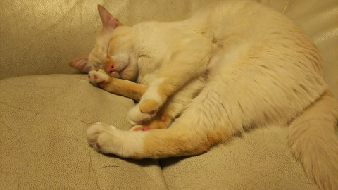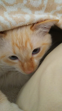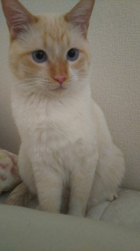 目が青く、白色で少しクリームががっています。首輪はしていません。