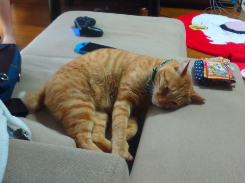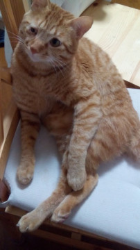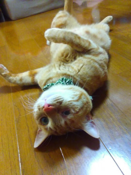 特徴は、茶トラの♂、去勢済み。拾った時から右目が開ききらず、ぱっちり目ではありません。