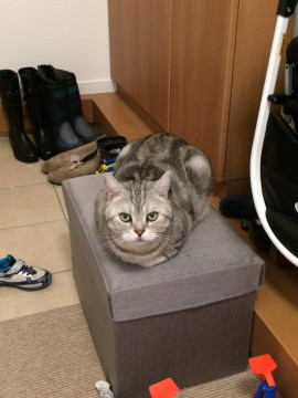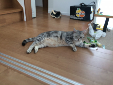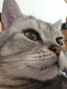灰色がかった毛色のアメリカンショートヘアです。お腹がぷよぷよしており少し太めです。
