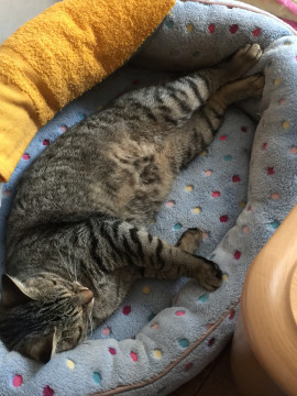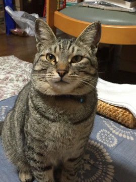 キジトラ、長めカギ尻尾の雄猫です。