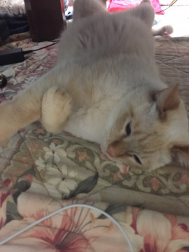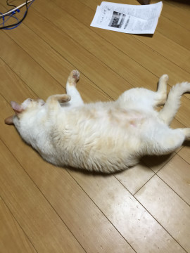 全体的にクリーム色で、柄としては白が強めの茶トラ白っぽいです。