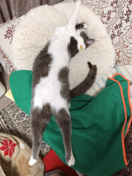 グレーと白の猫です。足先と胸からお腹にかけてが白で背中がグレーです。
