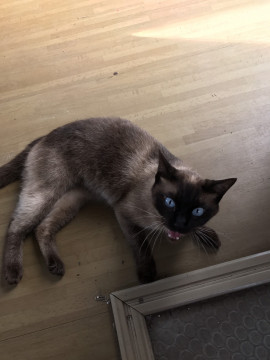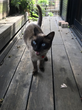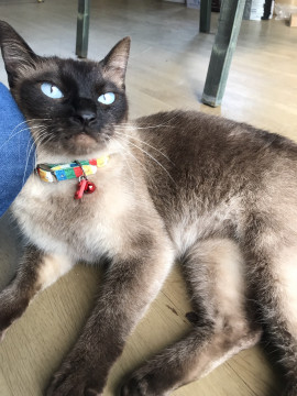シャム柄で首輪付きです。慣れると足元にスリスリしてきます。