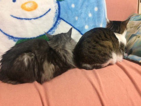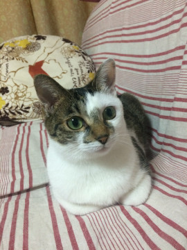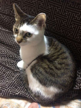 人懐こいです。黒白ですが、黒い部分はキジが入ってます。身体は小さめで、顔も小さく目が大きめです。名前を呼ぶと寄ってきます。
