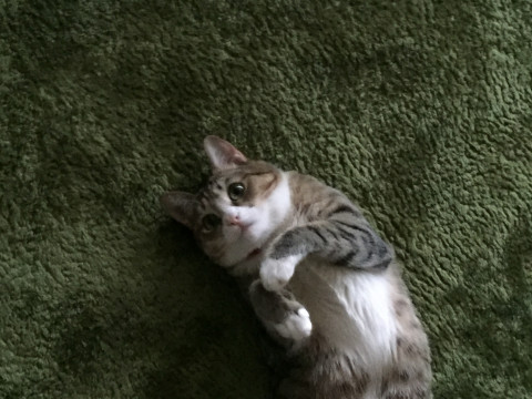 キジシロ 口元、おなかと足は白。尻尾と足付け根は黒いシマシマがはっきりあしてます。右耳の縁にゴマくらいのイボがあります。金鈴付きの赤い首輪をしています。完全室内飼い。内弁慶の怖がりです。