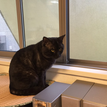 比較的大きくて細身な黒猫です。