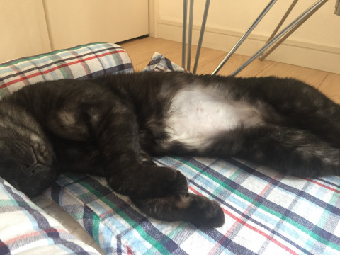 手術前だったのでお腹と両前足の一部の毛を刈っています。首輪はつけていません。