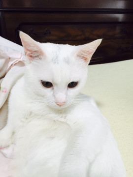 頭にうっすら黒い模様があります。身体は真っ白です。シッポは長く少し茶黄色です。