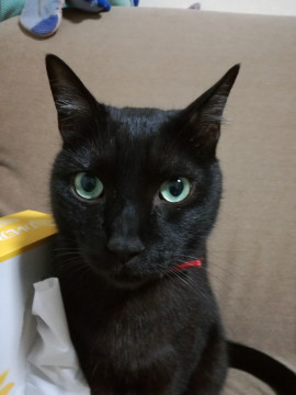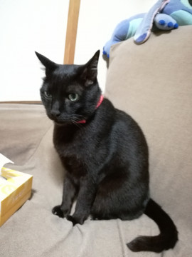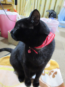 黒猫 去勢済み お腹に5センチ位の白毛があり、グリーン系の目、長い尻尾、赤いバンダナ風の首輪をしています。