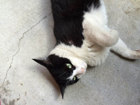 背中が黒くお腹が白のハチワレのオス猫(去勢済み)