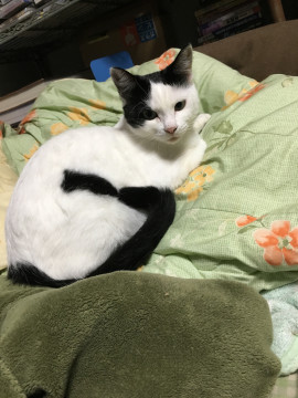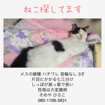 確信は無いのですが、念のためのご連絡です。9月1日18時半頃、写真に似た子を見ました。圦妻公園から道路を渡って水元公園に入ってすぐのあたりに猫たちがいついていて、薄暗くなると餌やりさんがくるので、集まってきます。その中の1匹が、胴体が白でしっぽが黒、胴体に1ヶ所だけ丸い模様が見えました。ハチワレが七三かはわかりませんでしたが、体型もメスっぽく見えました。間違いだったらごめんなさい。再会をお祈りしています。