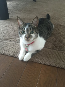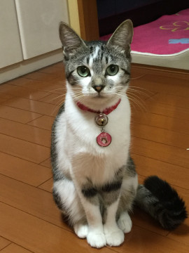 取れてなければ濃いピンクの首輪をつけていて、ネームタグも付いています。