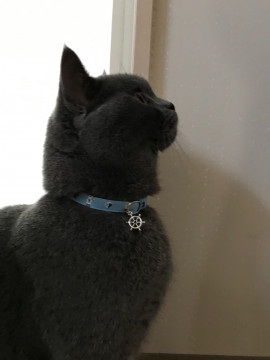 水色の首輪を付けています。