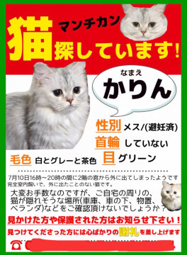 完全室内飼いだったので外に慣れてなく、近くで隠れているのか迷子になり遠くまで行ってしまっているのかわからないので広い範囲も探して居ます?