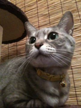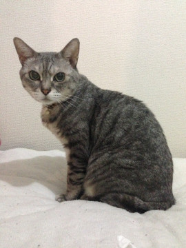 グレーと黒のしましま模様(サバ柄)で、お腹は白、目は緑色です。尻尾が短めです。