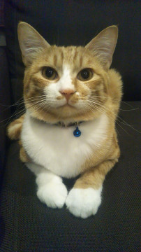 茶トラ白で青い鈴が付いた首輪をしてます。