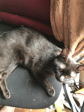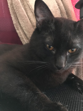 近くでよくみると白毛がつんつんと混じっていて、目の色は金です。首輪はつけていません。