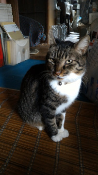 尻尾は長くまっすぐで、よく見ると先っぽにだけ白い毛があります。目は金色、黄色い首輪をしています。
