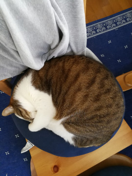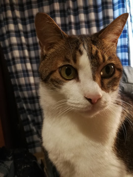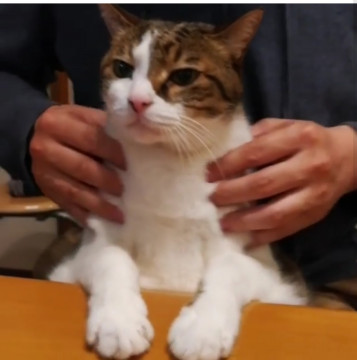 頭から背中に掛けてキジトラ。顔半分下からお腹に掛けては真っ白です。
