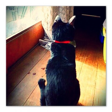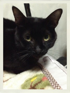黒猫で赤い首輪をしています。右前足のところに一部茶色の毛があります。