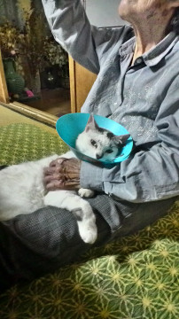 体質だそうです。いなくなったときは蚤とり用のピンクと白の首輪をしてましたがは引っかかると簡単に外れるようです しろいろでにしっぽやおしり足など一部黒と灰色のしま模様などがあります。きつい顔立ちです
