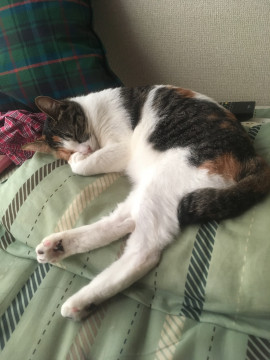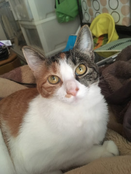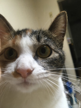 綺麗は8割れの三毛猫で鼻の下にわずかに黒い模様があります。
