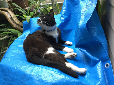 黒白猫で脚は4本共白靴下、鼻先が白地に黒のちょびヒゲ模様に黒の長尻尾、痩せ型で毛は間近で見ると本の少しだけ長く感じます。首輪はノミダニ避けと青白チェックのセーフティの2本しています。首輪の裏に連絡先が書いてあります。引っ掛けて外れていないと良いのですが...。追記です。最近お腹の辺りの毛の色が茶色っぽくなって来ていました。