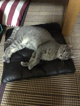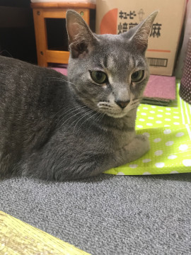 痩せ型で、グリーン系の瞳の少しツリ目の男の子です。毛色はトラ系のグレー(灰色)です。首輪はしていません。