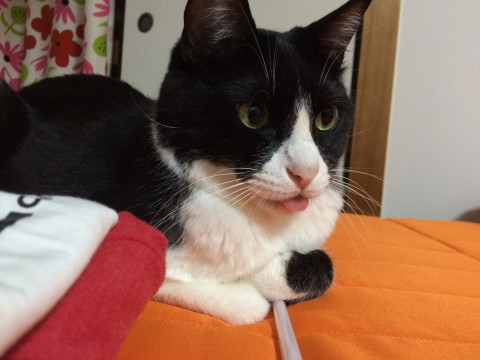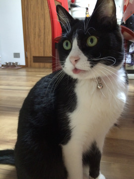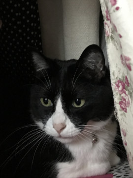 白黒、ハチワレ猫です。鼻筋から口の周りは白く、目の周り額、頭耳は黒です。背中は黒く首、腹は白