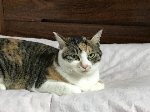 カギ尻尾のミケトラです。性格は臆病で人間が苦手です。不妊手術をしており、お腹周りが少し太め?