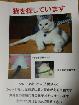 いつも家から出てもすぐ帰ってきたり家の周りにいるのですが、今回はなかなか帰ってこないので近所等を探しておりますが見つかりません