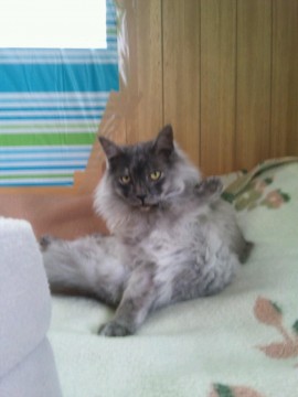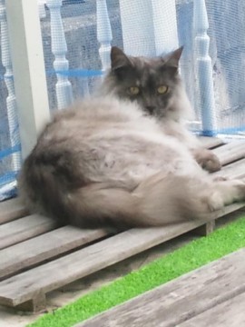 シルバーの長毛で顔が 黒く 白いタヌキみたいです。尻尾は丸まって居るのですが、毛が長いので 花が咲いたみたいになってます。
