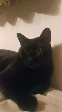 体重5、6kg。丸顔の黒猫です。尻尾は先まで太く、毛並みが少しざらざらです。目の色は緑です。去勢済み。耳の一部ハゲがあります。首輪無し、マイクロチップなし。