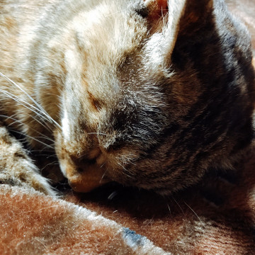 黒と茶色が混ざったキジトラで、しっぽがとても短く(丸く)、黒いのが特徴です。左耳がすこし切れています。