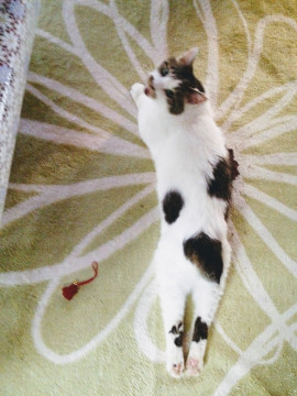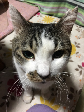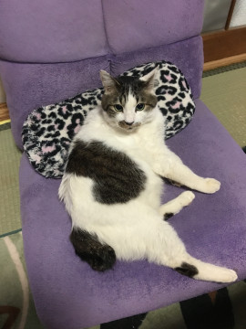 おデブちゃんです。背中辺りに黒ブチあり 尻尾は短く慢性鼻炎で いつも若干の鼻水付いてます。耳に去勢済みの桜カットしてます