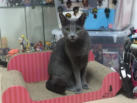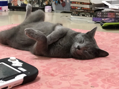 綺麗な艶のあるグレーの毛並みで、真ん丸なグリーンの瞳、避妊済みで下腹がポヨンと出ています。