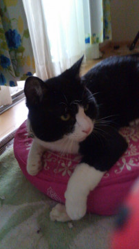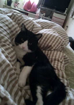 背中部分は黒、腹部は白い毛並みで長さは不ぞろいですが、すべての足先が靴下をはいているように白い毛がはえています。