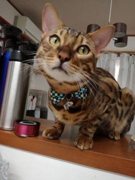 毛色は茶色で黒の斑点模様があります。しっぽは長くてまっすぐです。首輪は水色や白の大きな水玉模様で、一部がリボンの形になっていて、魚のチャームが付いています。