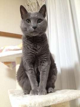 ロシアンブルーのようなグレー1色・ピンクの首輪・まっすぐで長いシッポ