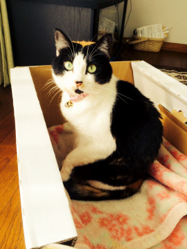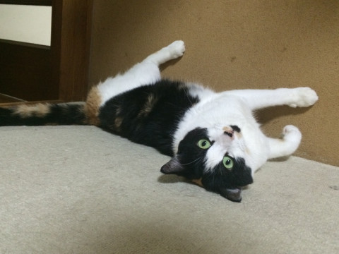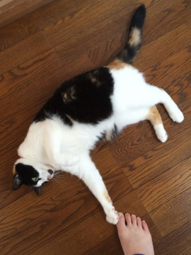 臆病な三毛猫(黒が多め)で、頭に手を近づけられると怖がってよけます。尻尾を触られるのが好きです。